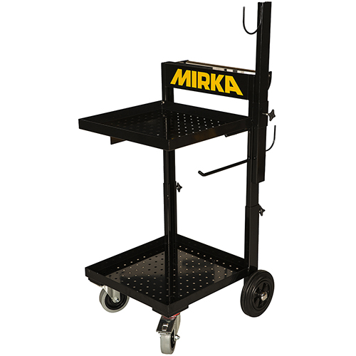 Тележка с регулируемой высотой и двумя полками из листового металла, нижняя для пылесоса и другая для продуктов. На правой стороне также имеется полоска с лентой для прикрепления ручных блоков и регулируемое подвешивающее устройство с левой стороны для подвешивания инструментов. Также имеется два крючка на задней стороне, чтобы повесить пылевой шланг. Эта тележка также подходит для пылеуловителя вместе с настенным шлифовальным станком Miro 955. Отзывы пользователей