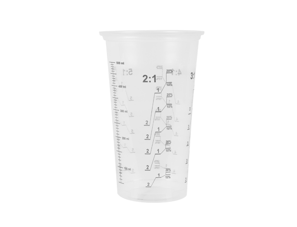 Градуированная кружка шкалою 1:1, 2:1, 3:1, 4:1, 5:1. Изготовлена из прозрачной пластмассы с хорошо читаемой шкалой, позволяющей легко смешивать краски и лаки в пропорциях, согласно шкалы. Кружка имеет закругления краев, что позволяет легко переливать содержимое в емкость покрасочного пистолета.