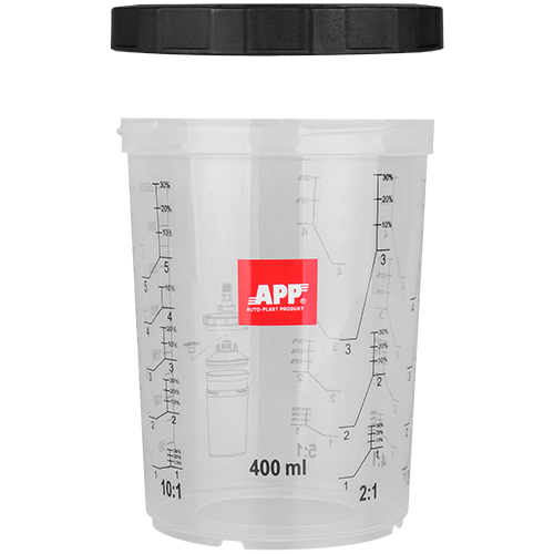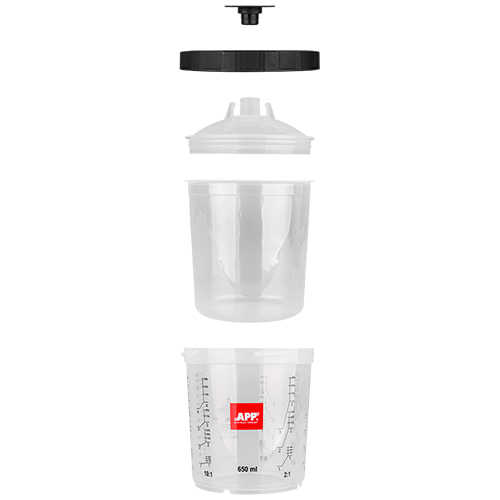 Система одноразовых красконаливных бачков, предназначенных для использования в краскопультах с верхним резервуаром и для смешивания красок и лаков с отвердителями и разбавителями в различных пропорциях. Изготовлена из прочного материала, устойчивого к химическим веществам, используемым в ремонтных и промышленных покрасочных мастерских и цехах. Точные деления позволяют получить необходимое количество готового к распылению продукта с сохранением правильных пропорций смешивания. Использование внутреннего мягкого бачка полностью изолирует лак от окружающей среды и позволяет работать с краскопультом в любом положении.