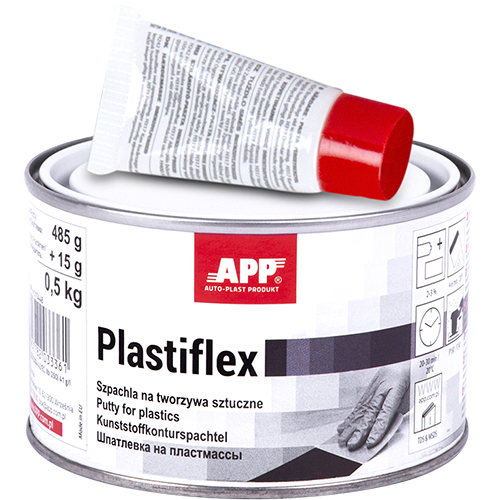 Двухкомпонентная, полиэфирная, наполняющая шпатлевка повышенной эластичности предназначена для заполнения углублений и выравнивания неровностей во время работ по ремонту элементов, изготовленных из пластмасс. Обладает очень высокой эластичностью и хорошей адгезией К большинству пластмасс, таких как бамперы, спойлеры, корпуса зеркал, молдеры и крылья. Благодаря кремообразной консистенции легко моделируется на поверхностях сложной формы. Ее легко применять и обрабатывать.