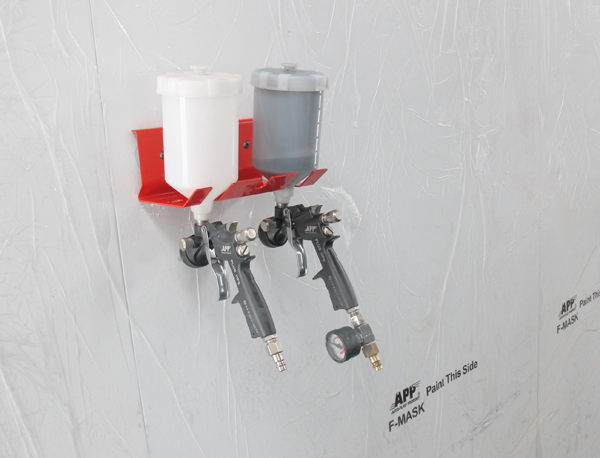 Единичная стойка позволяет вливать краски и лаки в емкость покрасочного пистолета и облегчает хранение пистолета в мастерской.