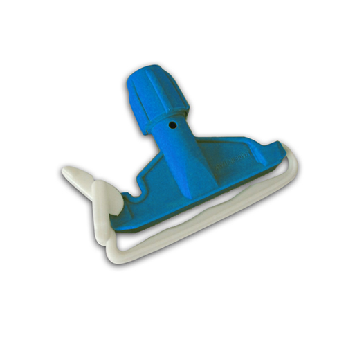 Пластиковый держатель веревочного мопа, имеет быстрозажимную клипсу для веревочного мопа и лепестковый зажим для рукоятки, цвет синий.