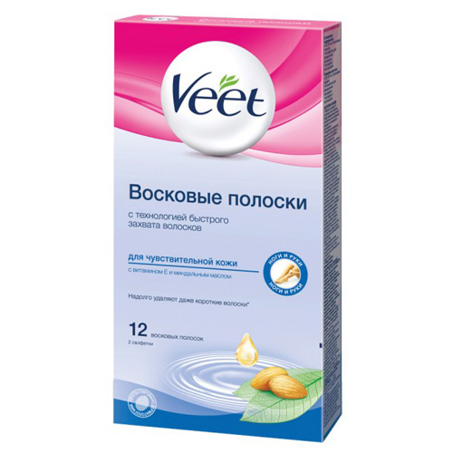 Восковые полоски для депиляции Veet для чувствительной кожи содержат Масло миндаля и Витамин Е. Витамин Е, является естественным антиоксидантом, замедляющим старение клеток и устраняющим воспалительные процессы на коже. Миндальное масло регулирует водный баланс кожи, активизирует процесс регенерации клеток, оказывает противовоспалительное, регенерирующее и тонизирующее действие. Отзывы пользователей