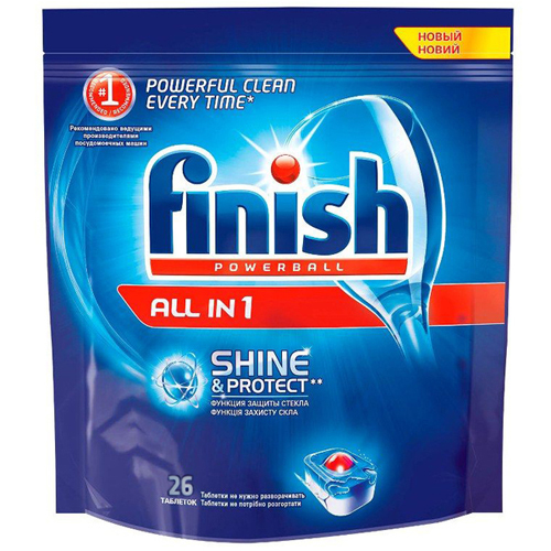 Таблетки для посудомоечных машин Finish All in 1 26 шт — моющее средство в виде таблеток для мытья посуды в посудомоечных машинах.