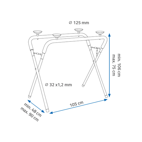 Технические параметры: - материал: оцинкованная сталь - размер трубы: 32 x 1,2мм - размер подставки: минимальный (дл. шир. выс.): 1050x900x750 мм - размер подставки: максимальный (дл. шир. выс.): 1050x480x1060 мм - защитное покрытие: серая пенка EPE - крепление: 125 мм (4 шт. в комплекте с болтами) - грузоподъемность: до 150 кг - вес: 8 кг,
